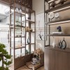 Cùng theo chân PenViet bước đến không gian kế tiếp là hệ thống tủ đồ phong thủy đặt sát tường. Những mẫu kệ tủ này được thiết kế có hình mái nhà cổ xưa đầy ấn tượng với gam nâu làm nổi bật sản phẩm. Bên cạnh đó là bàn thờ Phật được bố trí chính giữa hai kệ gỗ rất hài hòa. Bạn sẽ cảm nhận thấy sự thanh tịnh, nhẹ nhàng khi đứng trước bàn thờ Phật được trưng bày tại đây.