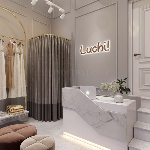 Luchi là cái tên mà chị đặt cho shop quần áo của mình. Chúng tôi làm nó nổi bật bằng cách thiết kế toàn bộ nên biển bằng màu xanh nhạt. Chữ để đèn led sáng khiến khách hàng dễ dàng nhìn thấy từ xa. Bạn sẽ không nhìn thấy sự phức tạp cầu kì trên biển tên.