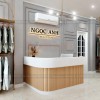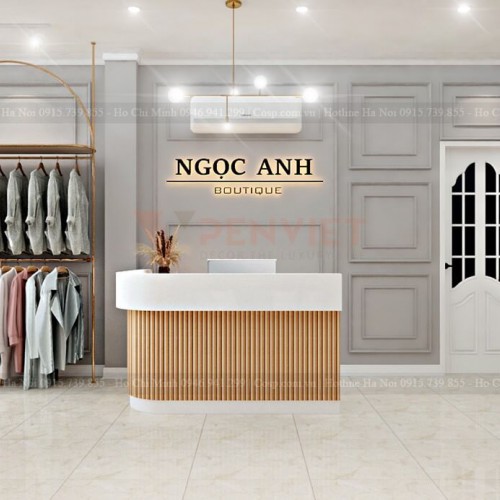 Thiết kế cửa hàng thời trang Ngọc Anh Boutique sử dụng mẫu quầy thu ngân bằng gỗ MDF phun sơn Inchem đơn giản nhưng được phối màu và xử lý tạo rãnh tinh tế, mang đến cảm nhận về sự hiện đại, sang chảnh cho không gian.