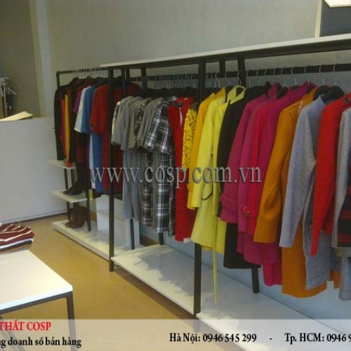Bề mặt sắt được phủ sơn tĩnh điện có khả năng chống trầy xước, han gỉ để nâng cao tính thẩm mỹ và tuổi thọ của sản phẩm. Thay vì cố nhồi nhét để trưng bày sản phẩm thật nhiều bằng cách thiết kế kệ trưng bày nhiều tầng để tận dụng không gian trên cao thì các kệ treo quần áo trong shop chỉ được thiết kế với 1 tầng với chiều cao vừa phải.