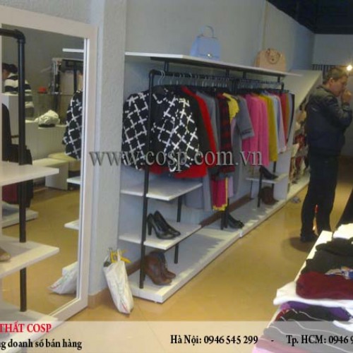 Kệ trưng bày sản phẩm bên dưới ngoài chất liệu gỗ MDF sơn bệt màu trắng còn được kết hợp với phần khung sắt sơn tĩnh điện màu đen thể hiện sự trẻ trung, hiện đại và rất phóng khoáng cho mẫu thiet ke shop thoi trang. Chất liệu sắt ống đem lại cho các kệ trưng bày thiết kế thanh lịch, mảnh mai mà vẫn đảm bảo chất lượng, khả năng chịu lực cao.