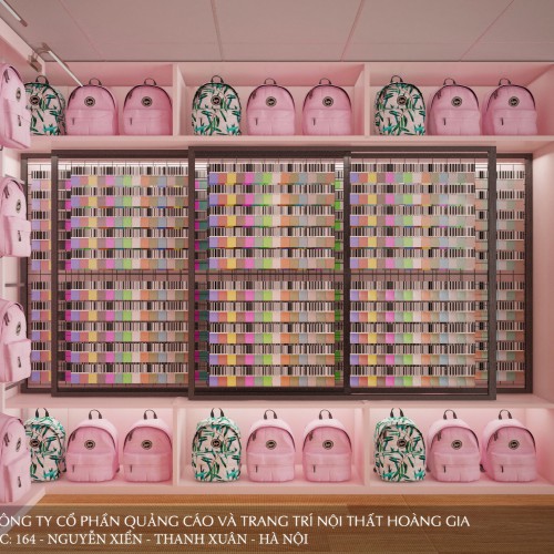Trước tiên, đến với shop túi xách Sanda người ta ấn tượng bởi không gian shop được thiết kế với tông màu chủ đạo là màu hồng phấn, màu hồng của sự tinh tế, nhẹ nhàng nhưng vẫn được nét nữ tính, ấm áp, lãng mạn vốn của lối thiết kế này. Trần nhà được sử dụng là gam màu lạnh, ý tưởng của nhà thiết kế sử dụng màu xám kẻ ( gam màu lạnh) cho trần nhà được cao hơn giúp không gian của hop túi xách nhìn được rộng rãi, thoải mái hơn.