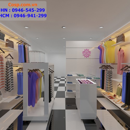 Ý tưởng: Sản phẩm shop bán là phụ kiện thời trang nên yêu cầu phải có nhiều nơi để trưng bày các loại mặt hàng đa dạng, phong phú. Chị Vân mong muốn thiết kế shop thời trang của mình phải thể hiện được sự thoải mái nhất có thể cho khách hàng khi tới đây xem và mua sắm. Shop sẽ phải trông thật rộng rãi và lịch sự trong tâm trí của mỗi vị khách ghé qua.