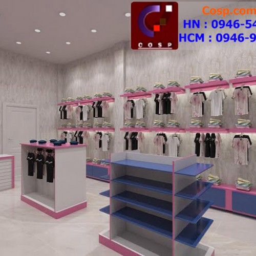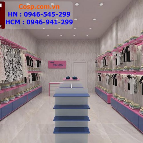 Giá treo, tủ đựng đồ được sắp xếp gọn gàng, ngăn nắp với màu sắc dễ thương phù hợp với cả bé trai và bé gái. Nói chung thiết kế shop thời trang này tạo được một không gian mua sắm rộng rãi, giúp khách hàng thoải mái di chuyển giữa các khu vực để lựa chọn đồ mà không hề cảm thấy vướng víu, khó chịu.