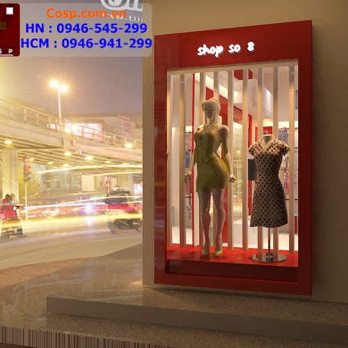 Showwindow trưng bầy manocanh với những bộ quần áo thời trang tiêu biểu, nổi bật của cửa hàng.