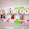 Vật liệu chính được sử dụng để thi công các tủ kệ trong cửa hàng là gỗ MDF. Đây là loại vật liệu gỗ rất được ưa chuộng trong trang trí shop nói chung và thiết kế cửa hàng thời trang trẻ em nói riêng.