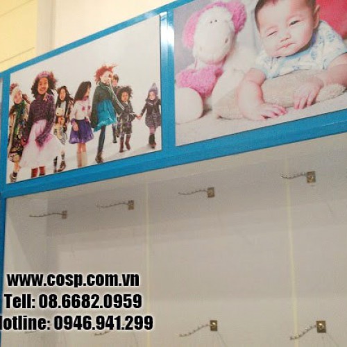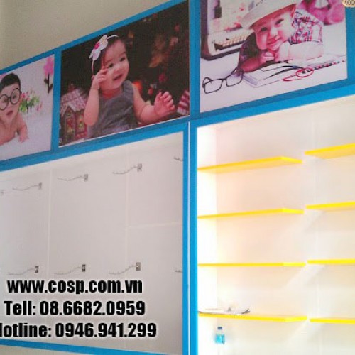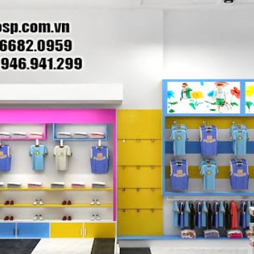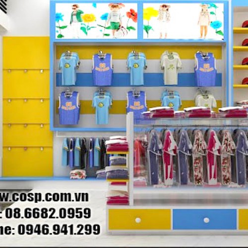 Hệ nội thất được sử dụng trong mẫu thiết kế shop thời trang này là các sản phẩm kệ giá làm từ gỗ công nghiệp MDF phun sơn 2K chống ẩm và được bố trí sát hai bên tường. Đây là chất liệu thường xuyên được sử dụng khi thiết kế shop trẻ em vì nó dễ sơn được nhiều màu sắc khác nhau và cũng chống được mối mọt cũng như giá thành rẻ.