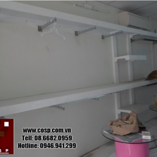 Hệ thống tủ kệ được làm đơn giản chạy hai bên tường kết hợp với suốt treo đồ, để tiết kiệm không gian cho cửa hàng. Ngoài ra còn kệ trưng bày giữa nhà. Với màu sắc chủ đạo là trắng và thiết kế mở của tủ kệ góp phần làm không gian thoáng, tạo cảm giác rộng rãi hơn nhờ thiết kế shop quần áo trẻ em.
