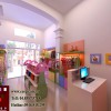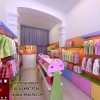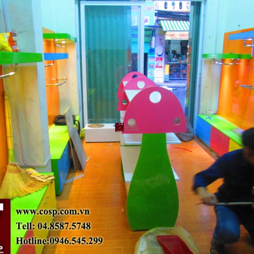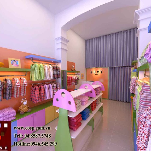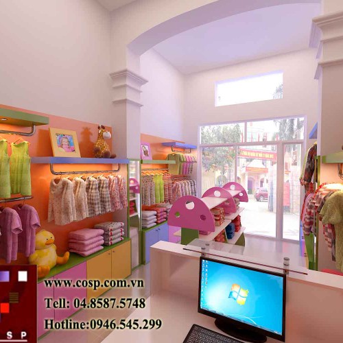 Vì mặt hàng đang bày bán trong shop là các sản phẩm quần áo dành cho trẻ em nên KTS của Cosp đã thiết kế shop quần áo này với rất nhiều màu sắc khác nhau. Những sắc màu trắng, xanh lá, xanh dương, hồng, cam được bố trí xem kẽ nhau tạo nên một bản "hòa âm" màu sắc rất lạ mắt.