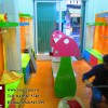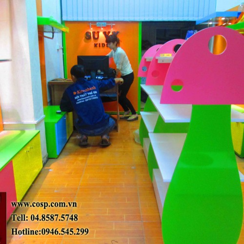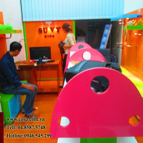 Ý tưởng thiết kế cửa hàng thời trang trẻ em Suvy: Tạo ra một không gian mua sắm thú vị và tràn đầy màu sắc cho bé. Hệ thống kệ giữa nhà được cách điệu từ hình dáng những cây nấm xinh xắn. Tủ và kệ rực rỡ, vui tươi với những màu sơn khác nhau.
