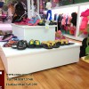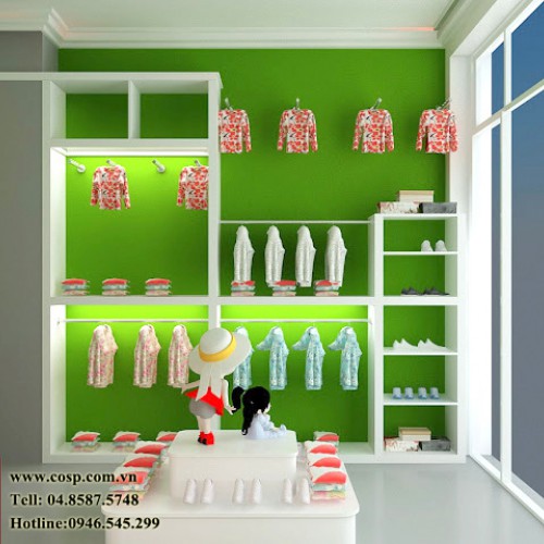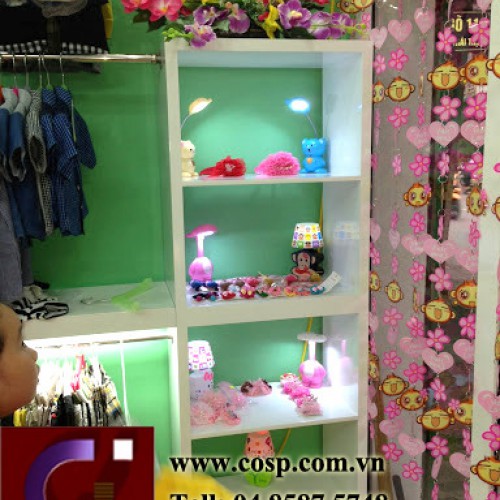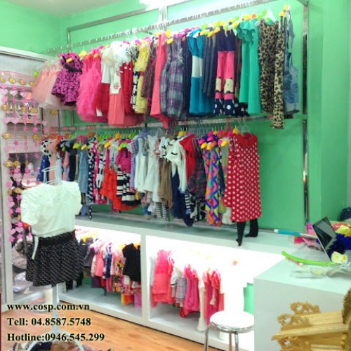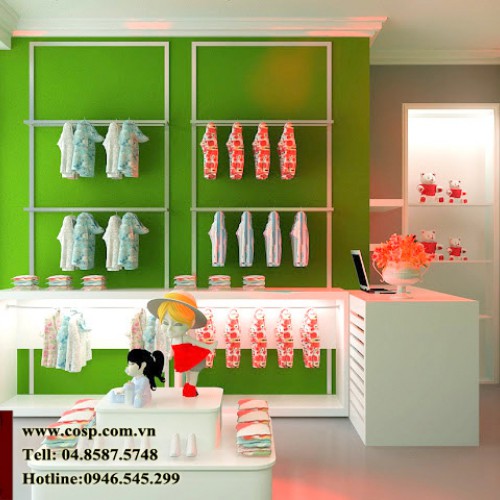 Nội thất shop thời trang trẻ em này bao gồm: quầy thu ngân, kệ giữa nhà, kệ sát tường, giá treo inox. Với các quầy kệ trưng bày hay quầy thanh toán đều được làm từ chất liệu gỗ công nghiệp MDF phun sơn để mang đến tính thẩm mỹ cho không gian bán hàng mà lại tiết kiệm được chi phí cho chủ đầu tư bởi giá thành của sản phẩm này khá rẻ. Do tính năng chống mối mọt, ẩm mốc, với giá thành phải chăng nên Cosp khuyên các chủ shop lựa chọn rất nhiều trong các thiết kế shop của mình.
