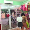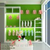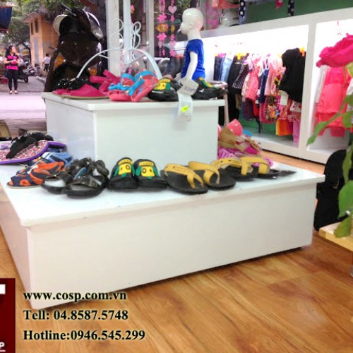 Kệ giữa nhà được chủ cửa hàng dùng để trưng bày các loại giầy dép. Kệ sát tường được dùng để trưng bày các sản phẩm như đèn bàn học sinh, kẹp tóc, balo túi xách. Giá inox sát tường được dùng để trưng bày các loại quần áo cho trẻ.