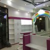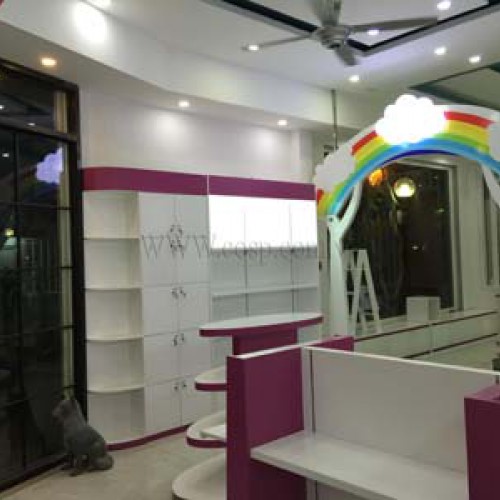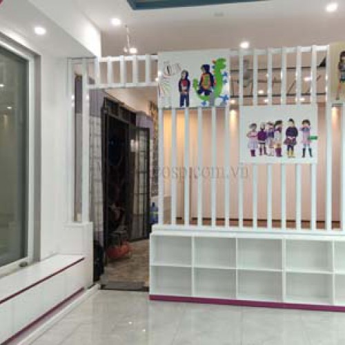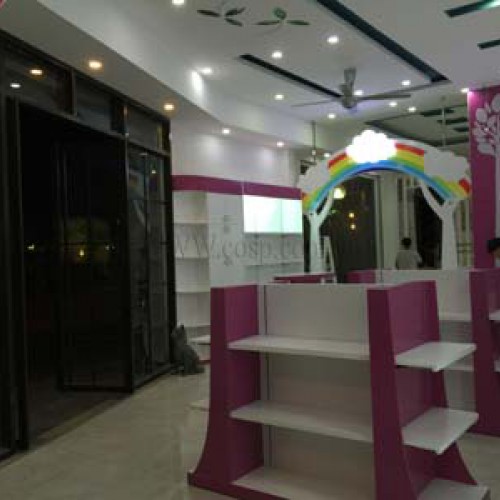 Nội thất khu vực bên trong cửa hàng, màu trắng được sử dụng nhiều hơn làm toát lên nét giản dị, trong sáng, hồn nhiên của trẻ thơ và điểm thêm màu tím tạo thêm nét lãng mạn, mơ mộng. Mặc dù các nội thất shop thời trang trẻ em này khá đơn giản nhưng vẫn toát lên được vẻ dễ thương nhờ vào việc kết hợp sắc màu phù hợp.