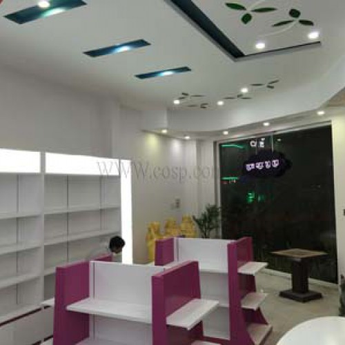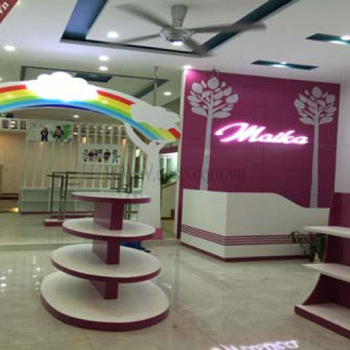 Các tủ và giá trưng bày được thiết kế khá đơn giản, với hai màu trắng và tím. Thiết kế shop trẻ em được sử dụng kính giúp mở rộng diện tích, tạo sự thông thoáng cho không gian bên trong cửa hàng.