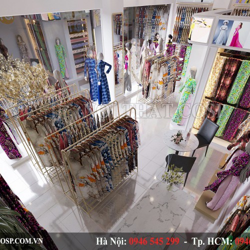 Nội thất shop thời trang bên trong chủ yếu làm từ chất liệu sắt sơn tĩnh điện. Ưu điểm của sắt sơn tĩnh điện là có độ bền cao, chống cong vênh và hơn nữa được mạ thêm một lớp crom vàng khiến cho tổng thể không gian shop áo dài trở nên sang trọng và thanh thoát hơn