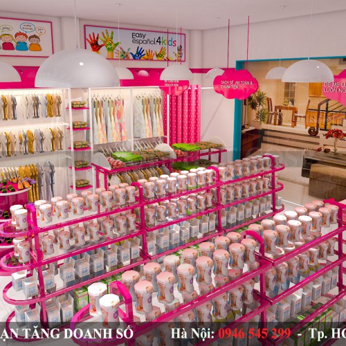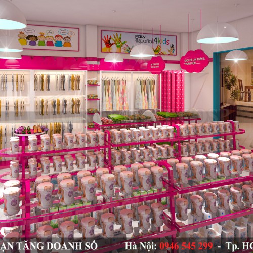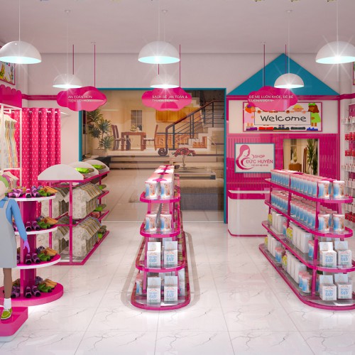 Không gian hiện lên với sự bắt mắt, tiện nghi. Hợp với đối tượng khách hàng. Vì khách hàng là hai lứa tuổi nên lựa chọn phong cách thiết kế shop cũng có điều phải thật chú ý.