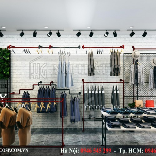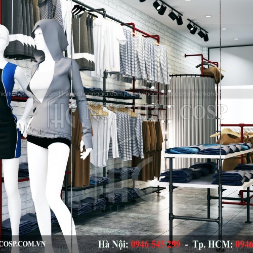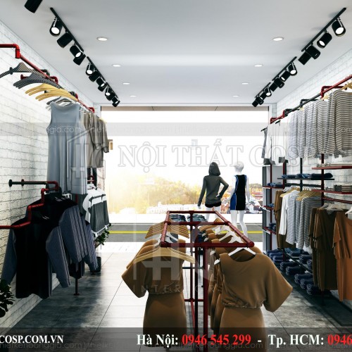 Cùng với đó là thiết kế nội thất bao gồm giá treo được làm từ chất liệu sắt sơn tĩnh điện vô cùng chắc chắn, không gỉ và bền đẹp theo thời gian. Hệ giá treo này được kê sát tường nhằm tiết kiệm tối đa diện tích cho không gian shop thời trang.