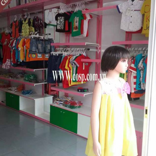 Tủ trưng bày thiêt kế âm tường giúp tiết kiệm diện tích. Sản phẩm trưng bày được phân chia rõ ràng, bên trái là đồ cho bé gái, bên tay phải cho bé nam, rất thuận tiện cho các bậc phụ huynh khi mua sắm. Hệ thống tủ trưng bày được thiết kế nhiều tầng, nhiều ngăn rất tiện dụng và thuận tiện chu chủ cửa hàng khi trưng bày sản phẩm. Trên trán tủ có gắn hình ảnh các em bé với gương mặt rạng rỡ khiến thiết kế cửa hàng quần áo trẻ em thêm phẩn vui tươi.