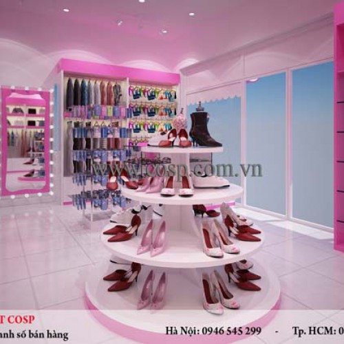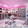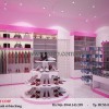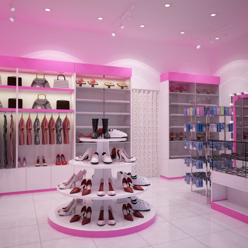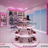 Không khí chung của cửa hàng có thể bị ảnh hưởng, tác động và biến đổi do tác dụng của màu sắc bóng đèn hay cường độ chiêu sáng. Với một không gian màu hồng nữ tính này, kiến trúc sư đã dùng cáo bóng đèn nhỏ cho ánh sáng dịu nhẹ, màu trắng để không gian thêm phần sáng sủa và tươi tắn. Giá kệ trưng bày sản phẩm trong shop được thiết kế đa dạng, phù hợp với từng chủng loại sản phẩm trưng bày.