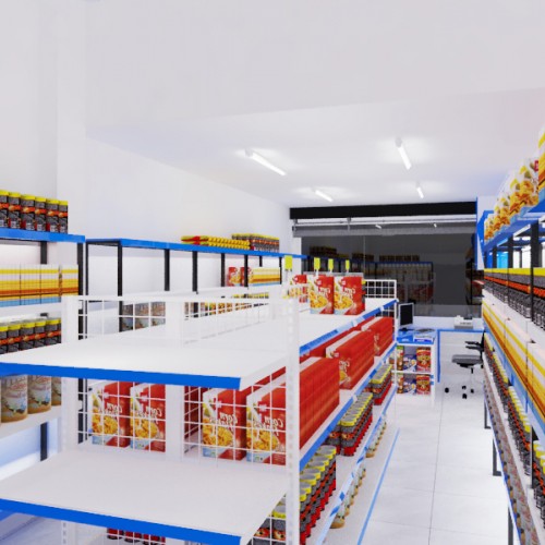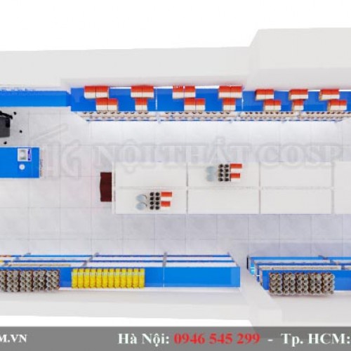 Hình ảnh thiết kế 3D shop bỉm sữa của Chị Hằng được thực hiện bởi các KTS của Nội Thất Hoàng Gia dựa vào nhu cầu thực tế của khách hàng. Cửa hàng được thiết kế với hai gam màu chủ yếu là màu trắng nhã nhặn và màu xanh nước biển tươi mát, nổi bật. Hai gam màu kết hợp hài hòa, uyển chuyển tạo cho không gian cảm giác thoải mái, sáng hơn.