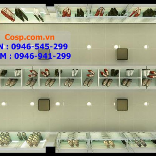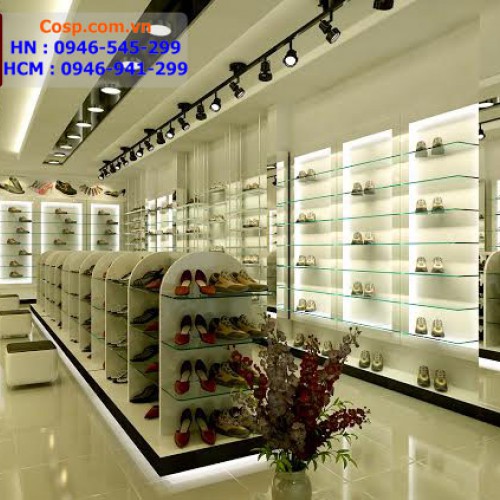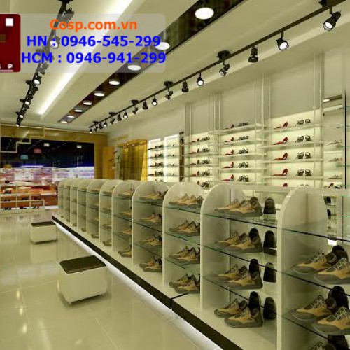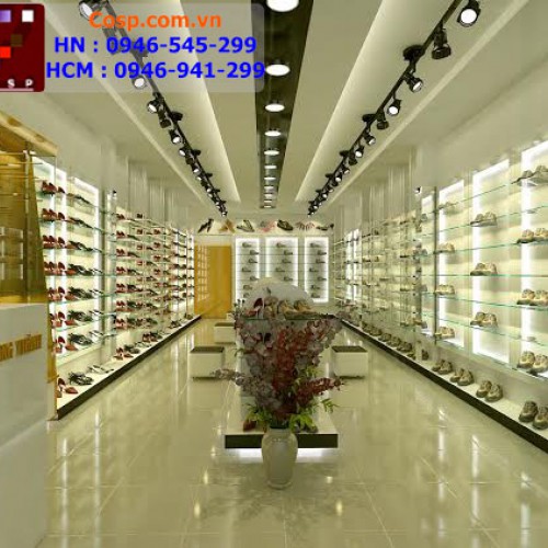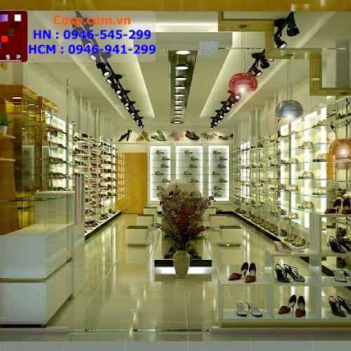 Bề ngang của shop khá hẹp, nhưng lại có chiều sâu, vì vậy thiết kế shop giày dép đã sử dụng những kệ và tủ trưng bày dài. Những kệ này được làm từ chất liệu gỗ công nghiệp MDF để tối ưu được ngân sách thiết kế tốt nhất mà vẫn đảm bảo tính thẩm mỹ cao hơn cho không gian bán hàng.