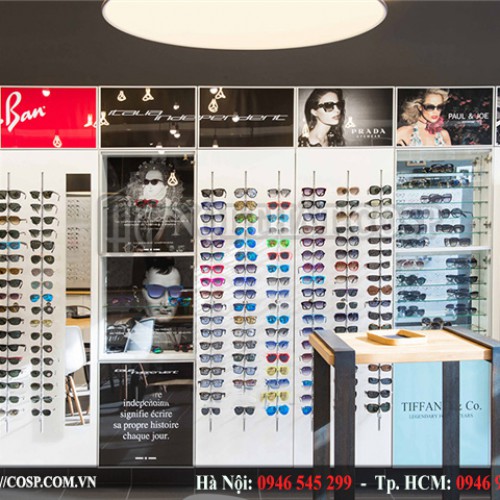 Khung treo trưng bày kính làm từ nhựa MDF phủ sơn 07 chống cong vênh mối mọt và có độ bền đẹp cao theo thời gian. Đối lập với mảng tường đen phía sau gây ấn tượng rất lớn với khách hàng và cũng đồng thời giúp shop kính mắt có hình khối bắt mắt hơn.