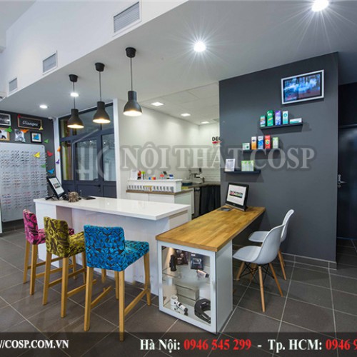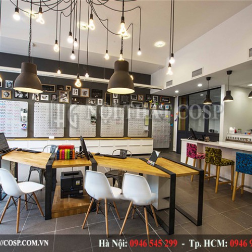 Chính giữa không gian là hệ bàn ghế tư vấn khách có thiết kế nội thất shop đơn giản, nhỏ gọn giúp tối ưu hóa, tiết kiệm phần lớn diện tích không gian. Được làm từ gỗ ép tự nhiên và sắt sơn tĩnh điện, đều là hai chất liệu có độ bền và khá vững chắc khiến không gian shop trở nên tiện nghi hơn, đem lại sự thoải mái cho khách hàng khi tới shop kính Anh Đại.