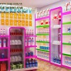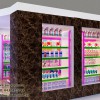 Tủ sát tường được bố trí các móc và giá treo và hệ thống đèn led hắt sáng làm nổi bật sản phẩm, kệ giữa nhà ngoài giá treo một mặt còn mặt khác được chia làm nhiều ngăn và tầng nhằm trưng bày các sản phẩm nhỏ hơn.