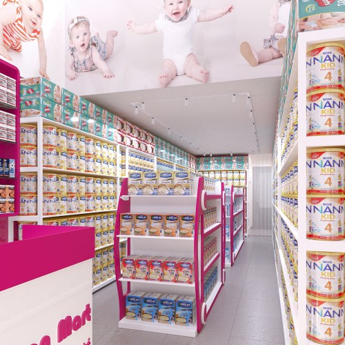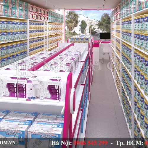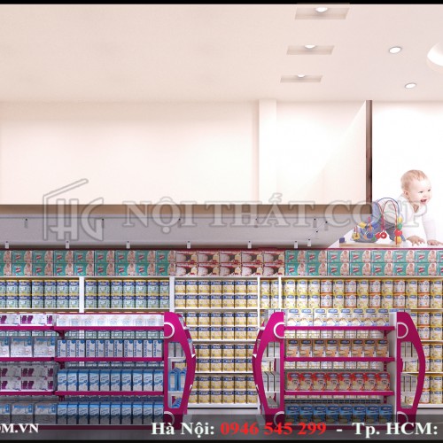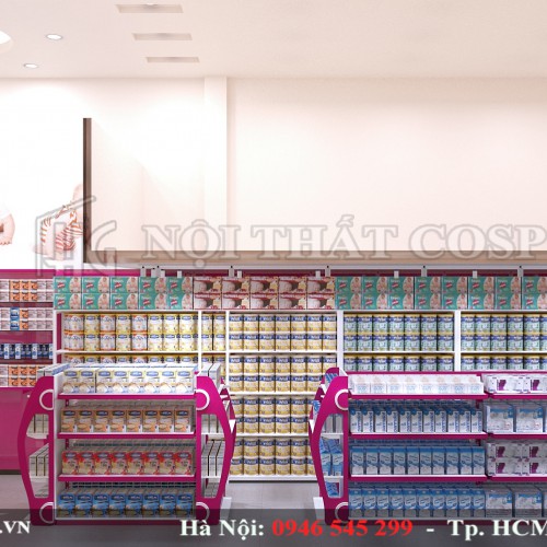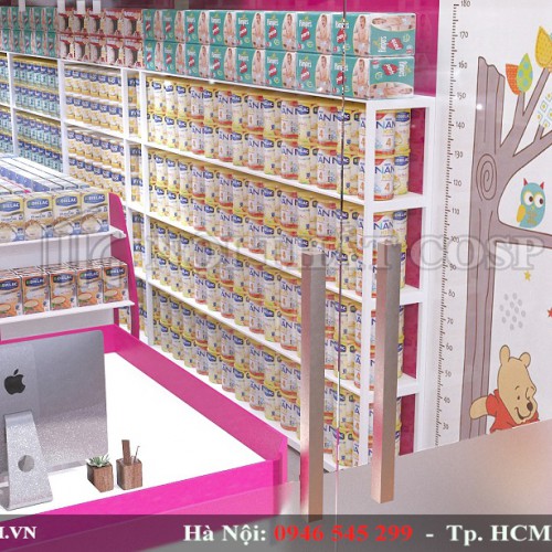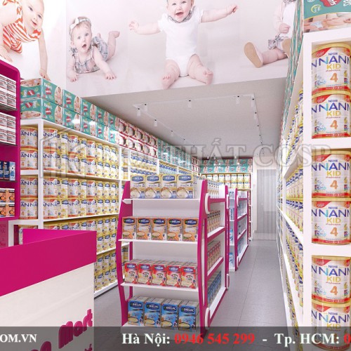 Do đối tượng khách hàng của shop là trẻ em nên anh Hải – chủ shop kinh doanh các sản phẩm sữa, bỉm,... muốn không gian cửa hàng mình phải đáng yêu nhưng vẫn đảm bảo tính thẩm mỹ, hiện đại.