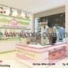 Quầy thu ngân được bố trí ngay phía bên phải lối vào với phía sau là tấm biển hiệu có thiết kế đơn giản, màu sắc tươi sáng nhưng không quá sặc sỡ. Màu sắc tươi sáng để phù hợp với một không gian kinh doanh sản phẩm dành cho trẻ em nhưng cũng không quá sặc sỡ để thiết kế shop mẹ và bé mà vẫn có được nét dịu dàng, trang nhã.