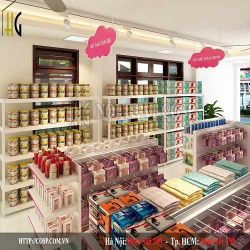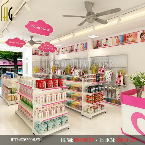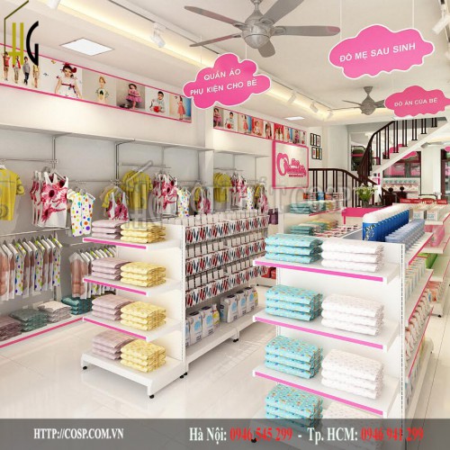 Ngoài sự gọn gàng, chúng còn mang tới sự thuận tiện cho khách hàng khi lựa chọn sản phẩm tại đây. Đồng thời, thiết kế shop baby này cũng được sơn 2 màu trắng, hồng chủ đạo để tạo một không gian bán hàng dễ thương, phù hợp với độ tuổi của các bạn nhỏ.
