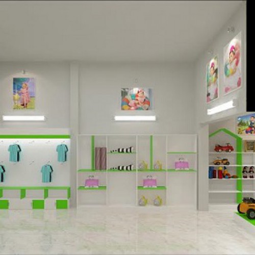 Ý tưởng khách hàng: thiết kế shop mẹ bé sử dụng chủ động tông màu trắng, xanh lá tạo cảm giác tươi trẻ, rất phù hợp để tạo nên một không gian trưng bày các sản phẩm dành cho trẻ nhỏ.