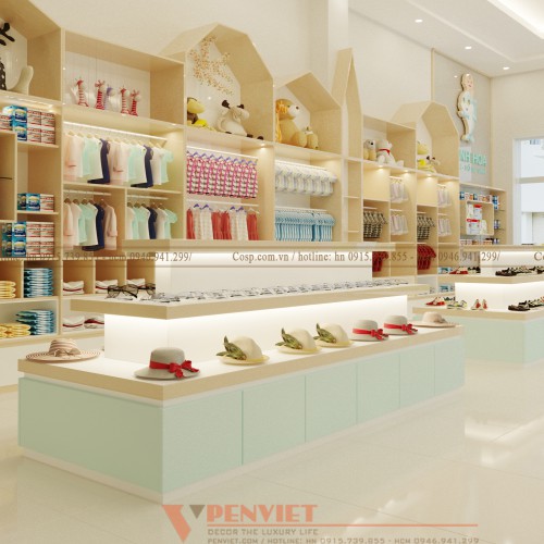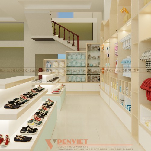 Tất cả các mẫu quần áo của trẻ được treo trên hệ thủ gỗ áp tường, còn các mẫu giày dép và mũ thì được bày bán ở hệ tủ đứng đặt giữa lối đi. Với hệ tủ đứng sát tường được thiết kế với nhiều kiểu dáng đa dạng, các đợt gỗ cũng được chia khác nhau phù hợp với từng loại sản phẩm trưng bày. Giữa các đợt gỗ và treo đều được lắp đặt thêm hộ thống đèn led nhỏ để cung cấp ánh sáng cho không gian trưng bày, giúp các sản phẩm trông nổi bật hơn.