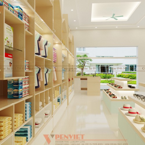 Bố cục các ngăn để đồ cũng rất hợp lý, giúp cho việc bày trí cũng như lựa chọn hàng hóa dễ dàng hơn. Sử dụng hệ tủ hình chóp nhọn giúp tạo điểm nhấn, thể hiện được sự nhịp nhàng, năng động, càng làm nổi bật hơn khu vực bày bán sản phẩm cho mẹ và bé.