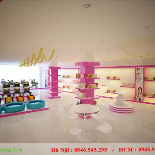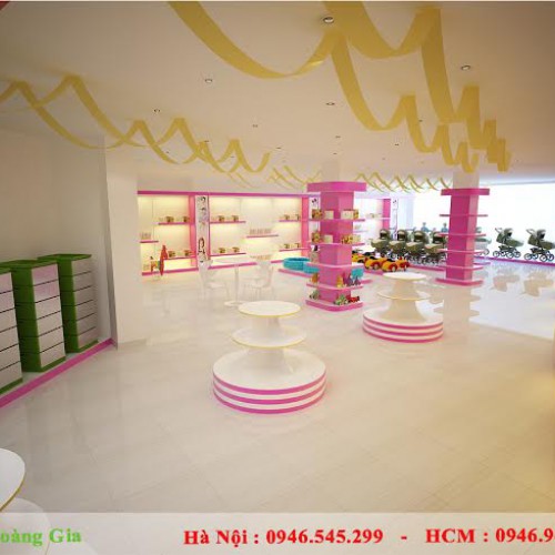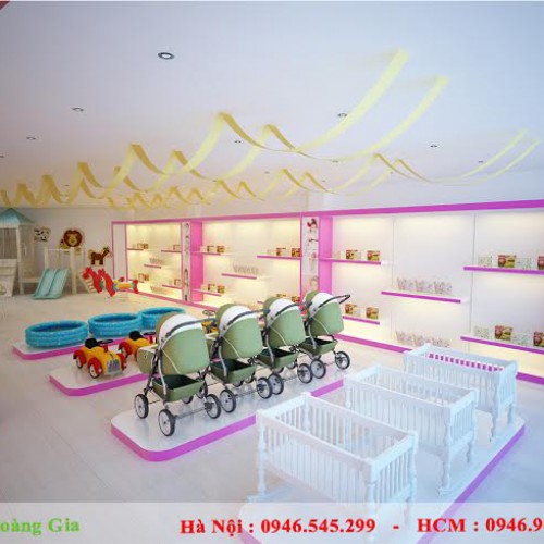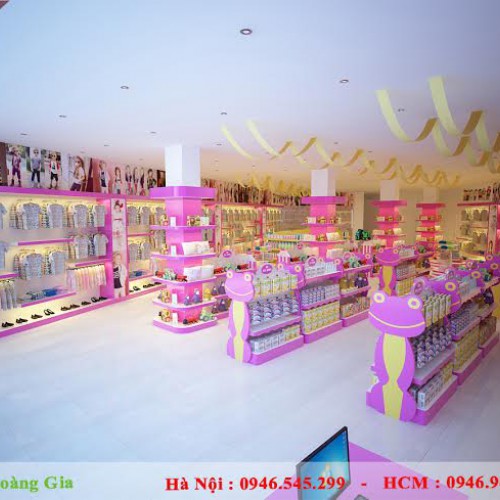 Các giá trưng bày sảm phẩm trong thiết kế shop thời trang mẹ và bé không chỉ được thiết kế với màu sắc phù hợp với trẻ nhỏ mà kiểu dáng cũng rất ngộ nghĩnh, đáng yêu khiến cho các bé thêm phần thích thú.