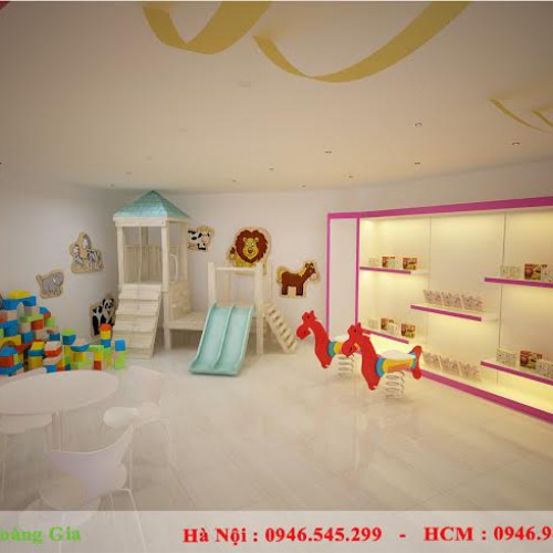 Trong mẫu thiết kế shop mẹ và bé này, một góc ở trên tầng 2 được sử dụng làm khu vực vui chơi bé và nghỉ chân cho phụ huynh. Bé sẽ thích mê khi vừa được đi mua sắm cùng bố mẹ vừa được chơi những trò chơi yêu thích như xếp hình, ngựa gỗ, cầu trượt...