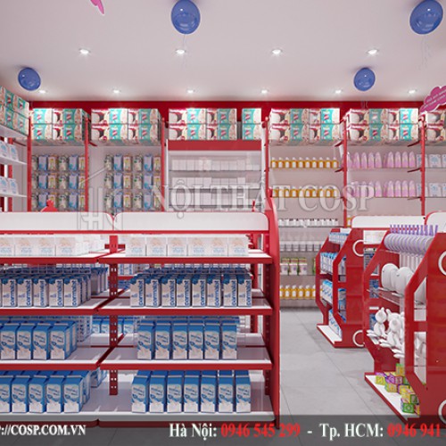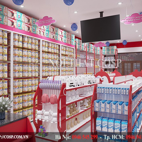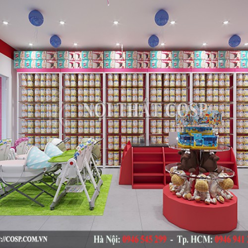 Vì sản phẩm mà siêu thị mẹ bé đang cung cấp ra thị trường chủ yếu là bỉm, sữa, đồ dùng dành cho trẻ sơ sinh nên khi thiết kế shop mẹ và bé này, KTS của Cosp đã lựa chọn các gam màu tươi sáng như hồng, đỏ và trắng. Những sắc màu này sẽ mang tới một không gian trẻ trung, tươi sáng và tạo sự chú ý tốt hơn với các bạn nhỏ.