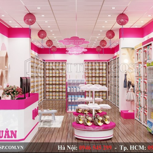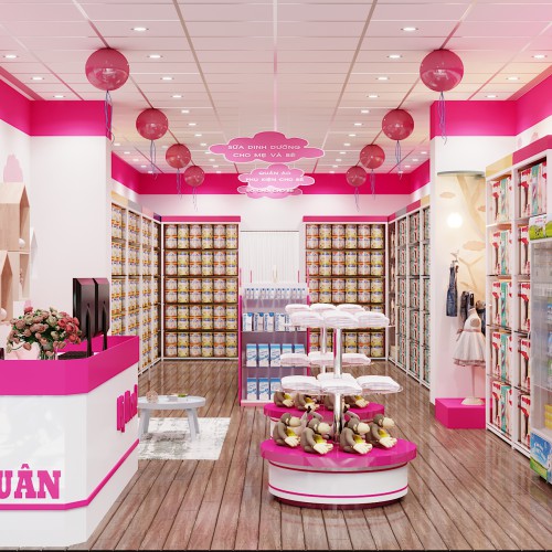 Shop mẹ và bé Thanh Xuân sử dụng màu trắng và hồng đậm làm tông màu chủ đạo. Hai màu sắc này tạo nên sự tương phản bắt mắt cho cửa hàng. Điều này giúp chúng tôi thành công trong việc thu hút được sự quan tâm của cả mẹ và bé. Màu sắc nổi bật được kết hợp tinh tế không chỉ mang đến một không gian năng động, hiện đại mà còn vô cùng chuyên nghiệp cho cửa hàng.