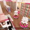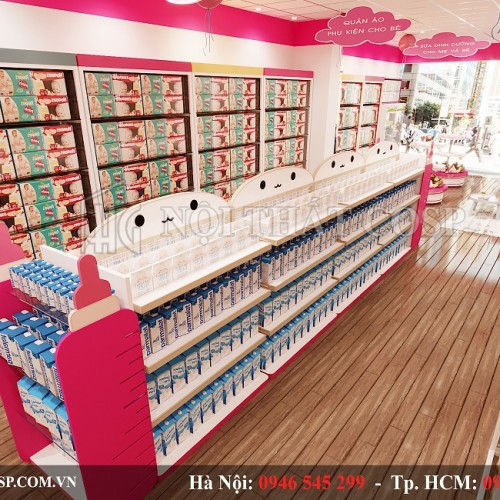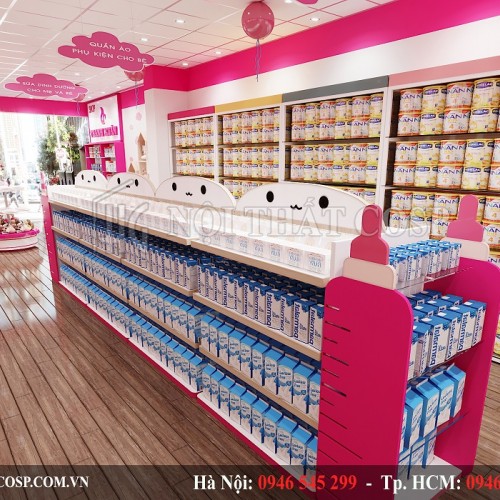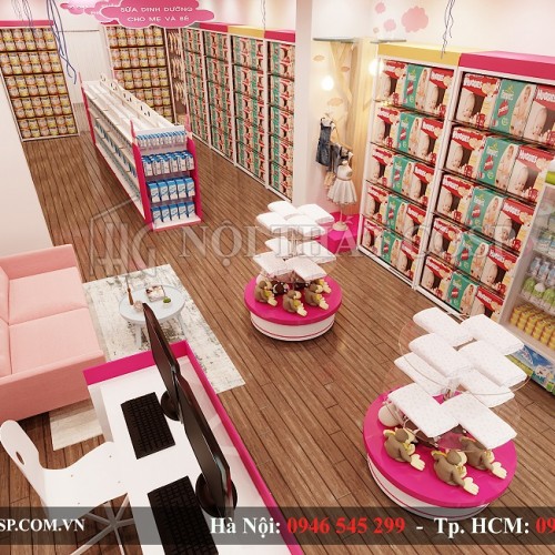 Bên cạnh đó, những chiếc kệ ở đây được làm từ chất liệu gỗ melamine cao cấp cùng với màu sơn hồng, trắng tạo thành dấu ấn riêng trong thiết kế shop. Hệ đèn rọi, đèn downlight ánh sáng trắng là yếu tố rất quan trọng đã góp phần khiến không gian nội thất shop mẹ và bé trở nên tươi sáng, sinh động hơn rất nhiều.