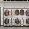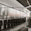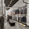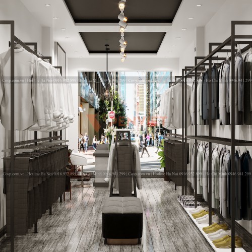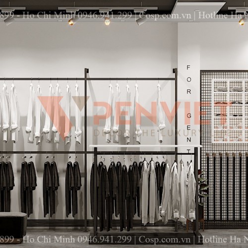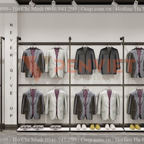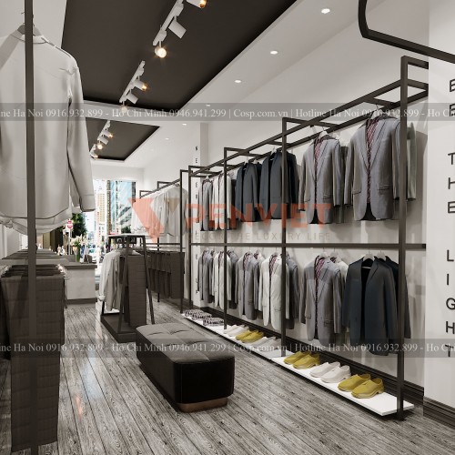 Đương nhiên, đối với một shop quần áo thì không thể thiếu các giá treo rồi đúng không nào. Các giá treo sử dụng trong thiết kế cửa hàng thời trang này đều là loại kệ trưng bày sát tường được làm bằng khung sắt sơn tĩnh điện rất chắc chắn. Với chiếc kệ treo các sản phẩm comple thì được lắp thêm đợt gỗ MDF phủ Melamine dày 17mm ở phía dưới để trưng bày một số mẫu giày.