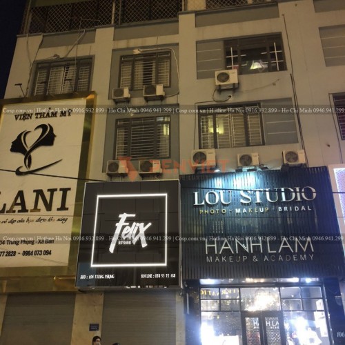 Bộ chữ logo “Felix store” bằng mica nổi phát sáng chân 5cm màu trắng sữa rất nổi bật trên nền màu đen. Còn bộ chữ địa chỉ và hotline cửa hàng được làm bằng mica dẹt không phát sáng. Bộ đèn led được gắn chạy quanh biển giúp thương hiệu càng thêm nổi bật dù mặt biển có màu tối đi nữa.