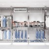 Phía bên trái tường này là hệ thống mắc treo sát tường. Nhà thiết kế thật thông minh khi sử dụng loại sắt sơn tĩn điện làm khung đỡ, bục đứng là gỗ MDF phủ Melamine, các đợt là kính thường 8li.