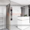 Ở bên phải sẽ bao gồm khu vực thay đồ bằng khung sắt tròn bên trên và rèm vài màu ghi. Quầy thu ngân trắng sang trọng bằng gỗ MDF phủ Melamine, viền nẹp inox, có thiết kế tủ khóa, ray kéo và đục lỗ đi dây máy tính.
