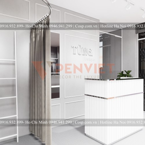 Thiết kế shop thời trang trước đó được penviet cải tạo không gian, cải tạo trần, cải tạo sàn và tường bằng thạch cao và sơn. Tường sau quầy được trang trí sang trọng với các phào chỉ PVC Hàn Quốc. Bộ chữ Tùng Boutique lại lần nữa được nhắc đến bằng mica dẹt không phát sáng.