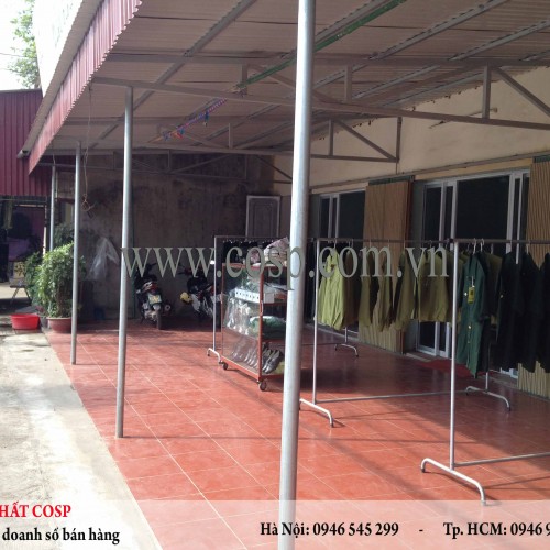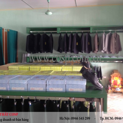 Ba dãy kệ với chân sắt chắc chắn được xếp song song với nhau nhằm gia tăng thêm khu vực treo những mẫu áo đồng phục của công ty. Mặt trên của kệ được làm phẳng để tận dụng để các sản phẩm trưng phụ kiện khác như giày, dép, mũ,... rất tiện lợi.
