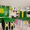 Trong mẫu thiết kế shop quần áo quân đội này, chúng tôi đã sử dụng bức tường kính màu xanh bóng loáng để lắp đặt cho khu vực lễ tân. Bức tường này được in chìm hình ảnh logo thương hiệu của công ty X20 màu vàng rất bắt mắt. Bộ ba đèn chiếu thẳng ánh sáng vào bức tường này để làm nổi bật thương hiệu hơn. Tại khu vực này được kê một bộ bàn ghế màu xanh, đồng màu với màu của các tủ kệ để các nhân viên bán hàng có thể ngồi kiểm kê, xuất hóa đơn thoải mái.