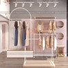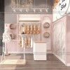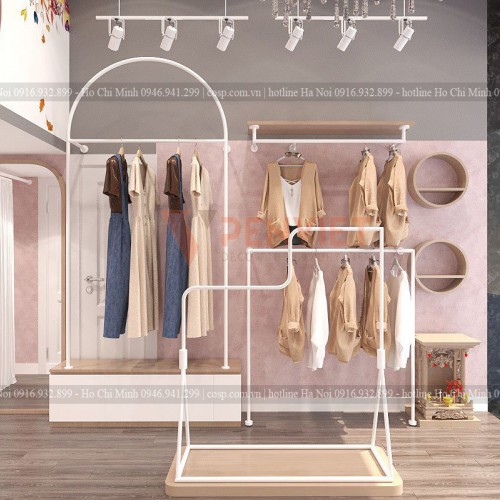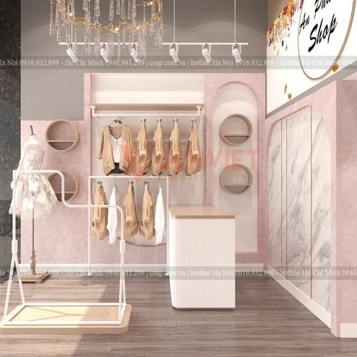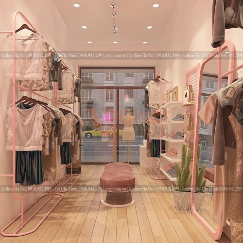 Thiết kế shop thời trang sử dụng tông màu hồng và trắng kết hợp tạo nên một không gian màu sắc xinh đẹp và vô cùng sang trọng. Shop có diện tích nhỏ nên kiến trúc sư sắp đặt không gian nội thất, quầy kệ phù hợp mang lại sự thông thoáng cho khách hàng đến mua sắm được thoải mái. Hệ quầy kệ trưng bày các sản phẩm là giá treo, bục gỗ, kệ áp tường và tủ kết hợp kệ nhiều tầng giúp trưng bày các sản phẩm được phù hợp và dễ dàng.