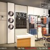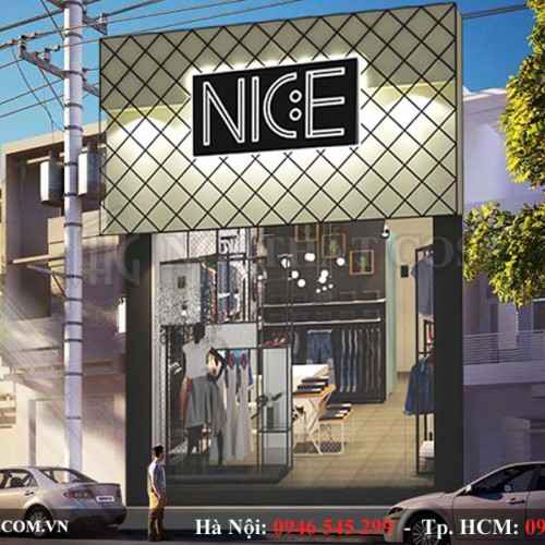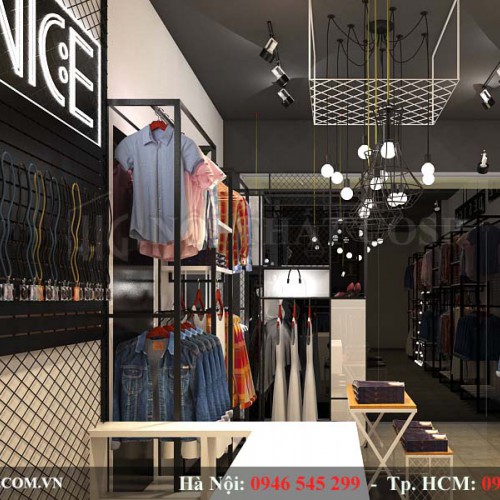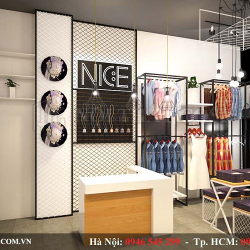 Hệ tủ trưng bày thời trang với nhiều ngăn chứa đồ độc đáo, sản phẩm quần áo được treo trên kệ sắt phun sơn tĩnh điện chắc chắn, vừa tiết kiệm không gian cho shop và tạo nên nét hiện đại cho cửa hàng. Khu vực quầy lễ tân với chiếc bàn màu sáng có thiết kế nhẹ nhàng, kích thước vừa phải cho việc mua bán thuận tiện. Ngoài ra trong thiết kế shop quần áo này còn có phòng thử đồ để khách hàng có thể mặc thử quần áo mà mình chọn rồi đưa ra quyết định có nên mua hay không.