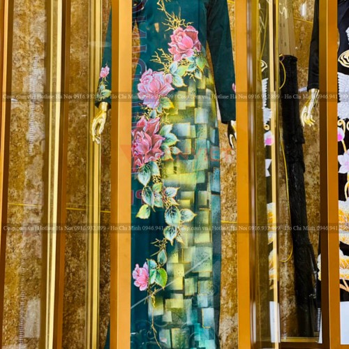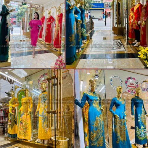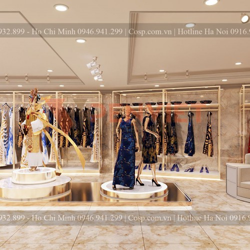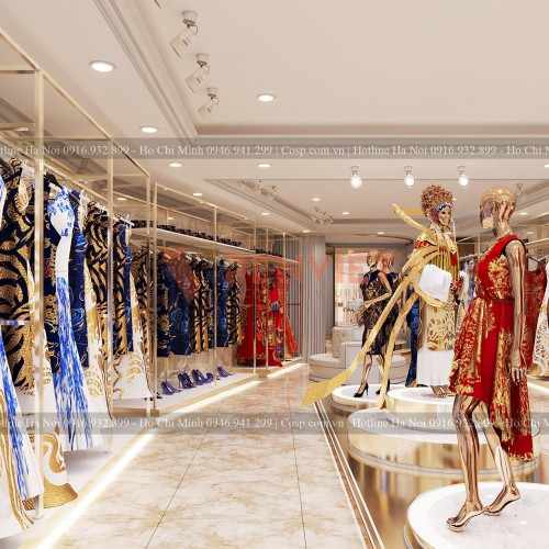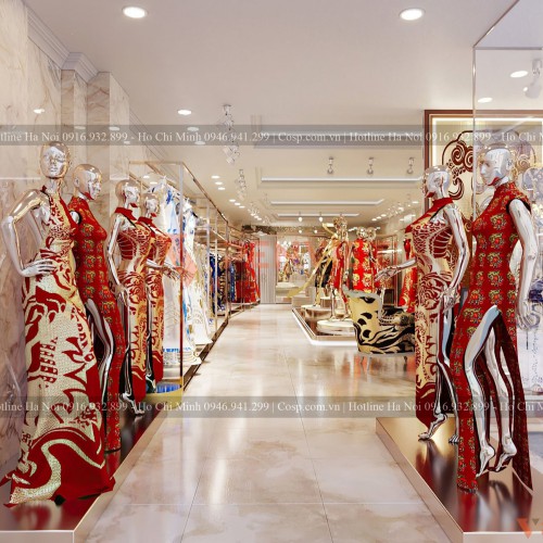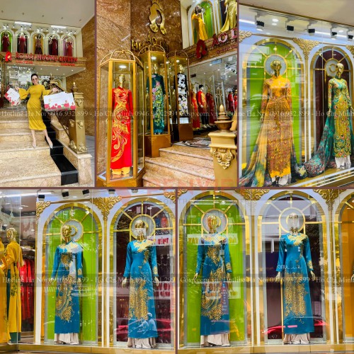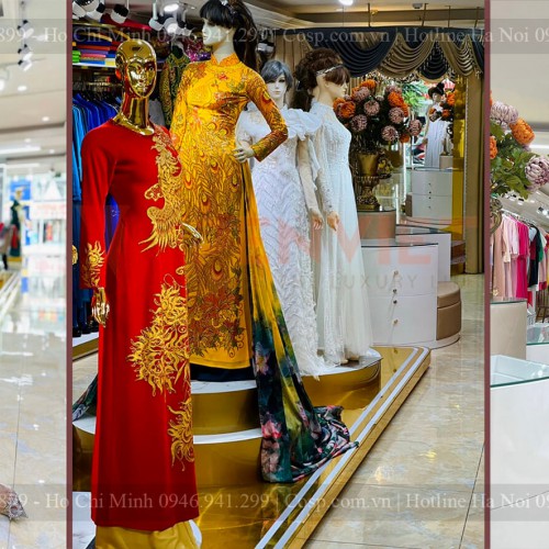Tiếp đến là khu vực trưng bày sản phẩm áo dài của shop với hai loại bục trưng bày Mannequin chính là loại sát tưởng và loại ở giữa nhà. Loại bục trưng bày Mannequin giữa nhà có phần chân phía dưới được làm bằng khung gỗ MDF lõi xanh cốt Thái chống ẩm (có hệ sắt hộp đi kèm để chịu lực).