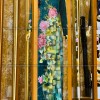 Họa tiết trang trí là gỗ cắt CNC sơn nhũ vàng, sau đó sơn PU. Gương màu lắp ở phía sau khung gỗ tạo hình cánh cửa, mặt trước là các thanh Alu vàng gương chia ô và có đèn Led chạy quanh khung gương. Phần hình tròn phát sáng là hộp đèn Mica trắng, kết hợp Alu vàng gương gắn trực tiếp vào khung gỗ vô cùng bắt mắt.